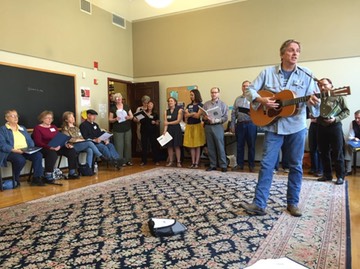 MD rehearsing with the Old Town School Folk Chorus AND the Power of Song Singers. Twenty-nine singers assembled on stage at the Old Town School to celebrate the musical legacy of America’s great songwriter, activist and folk icon Pete Seeger. April 24, 2016.