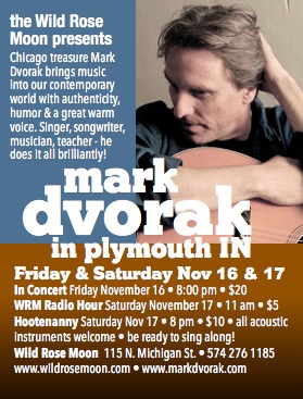PLYMOUTH IN - The Wild Rose Moon, 115 N. Michigan Street, welcomes Chicago’s “official troubadour” Mark Dvorak to its third annual Fall Folk Festival Friday, November 16 and Saturday, November 17.