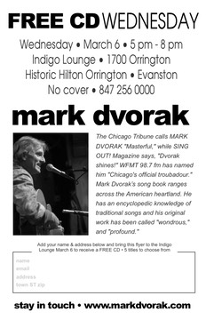 Mark Dvorak makes a rare cabaret appearance Wednesday, March 6, from 5 pm to 8 pm at The Indigo Lounge located in the historic Hilton Orrington Hotel, 1700 Orrington Avenue, Evanston IL.
