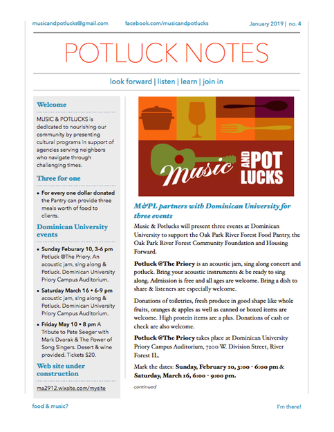 Fun music events coming your way presented by Music & Potlucks! Potluck @The Priory February 10 & March 16. A Tribute to Pete Seeger May 10 @ Dominican University, Folk Park Thursdays in Oak Park IL & FolkTober Fest 2019 - all to support the homeless, the hungry and our neighbors who are in need.