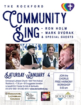 ROCKFORD IL - Emmanuel Lutheran Church, 920 Third Avenue will host Rockford’s fourth community sing on Saturday, January 4 at 7:30 pm. The event will support Emmanuel Lutheran’s Center for Arts & Spirituality. Suggested donation is $10. There will also be a free harmony singing workshop at 5:00 pm.