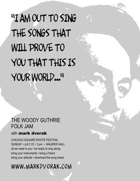 Join Mark Dvorak, Old Town School of Folk Music students, faculty and friends for the Woody Guthrie Folk Jam on Sunday, July 22 at 3 pm. The acoustic jam and sing along will take place in Maurer Hall, 4544 N. Lincoln Avenue, Chicago, as part of the Chicago Square Roots Festival, sponsored by the Old Town School of Folk Music and the Lincoln Square Chamber of Commerce.