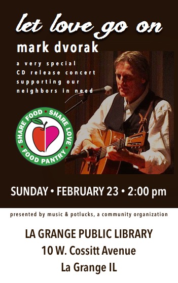 For more information on the event phone 312 4515101 or log on to www.musicandpotlucks.org. Learn more about the Share Food Share Love Pantry at www.sharefoodsharelove.com. Visit the La Grange Public Library at www.lagrangelibrary.org and find Mark Dvorak at www.markdvorak.com.